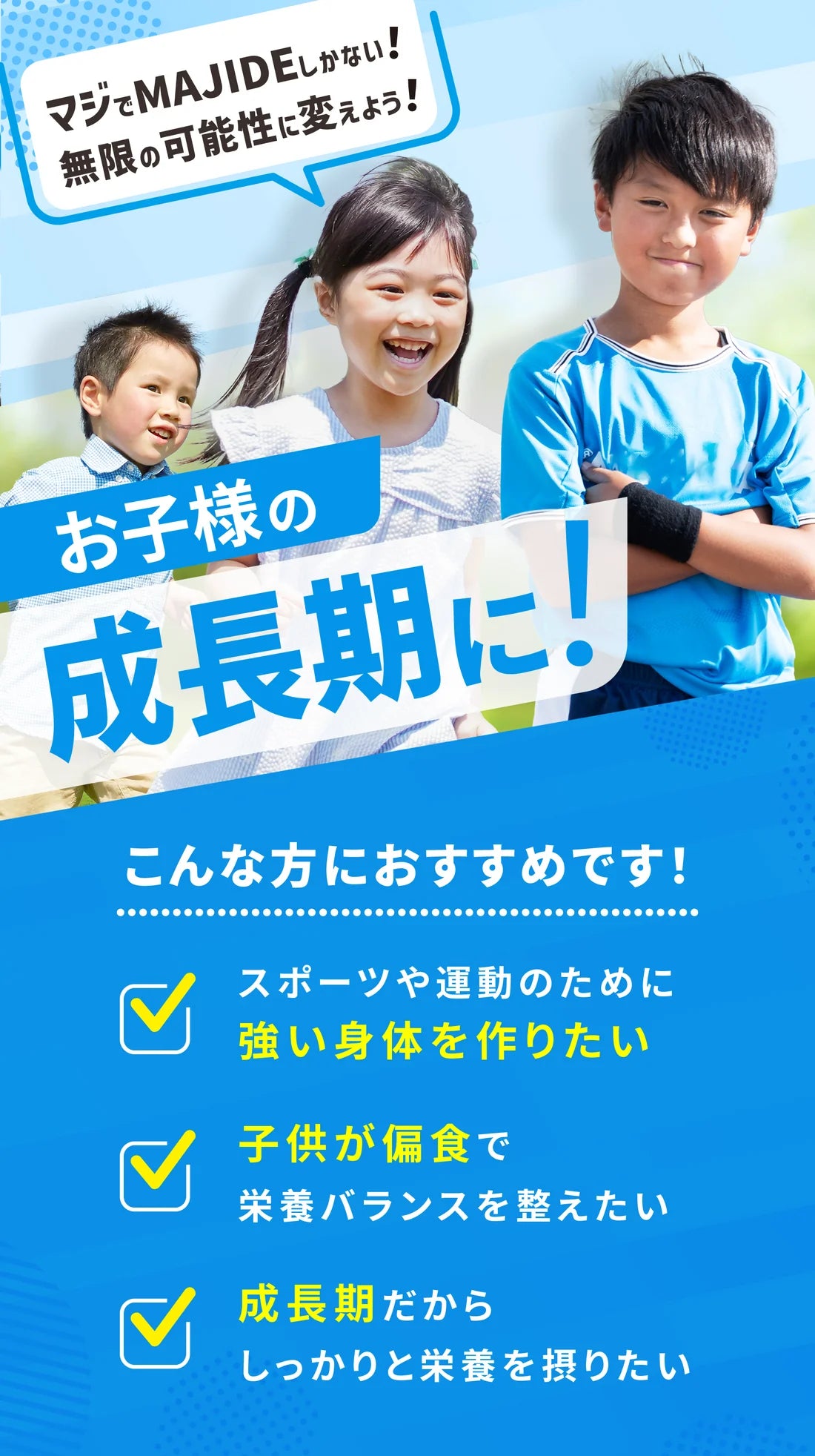 野菜嫌いやお菓子を食べがちな子どもは「ビタミン・ミネラル」が不足しがちです。食事をなかなか食べてくれない子供でも、豊富な栄養素を含むMAJIDEを飲むことによって、栄養素の偏りを補うことができます